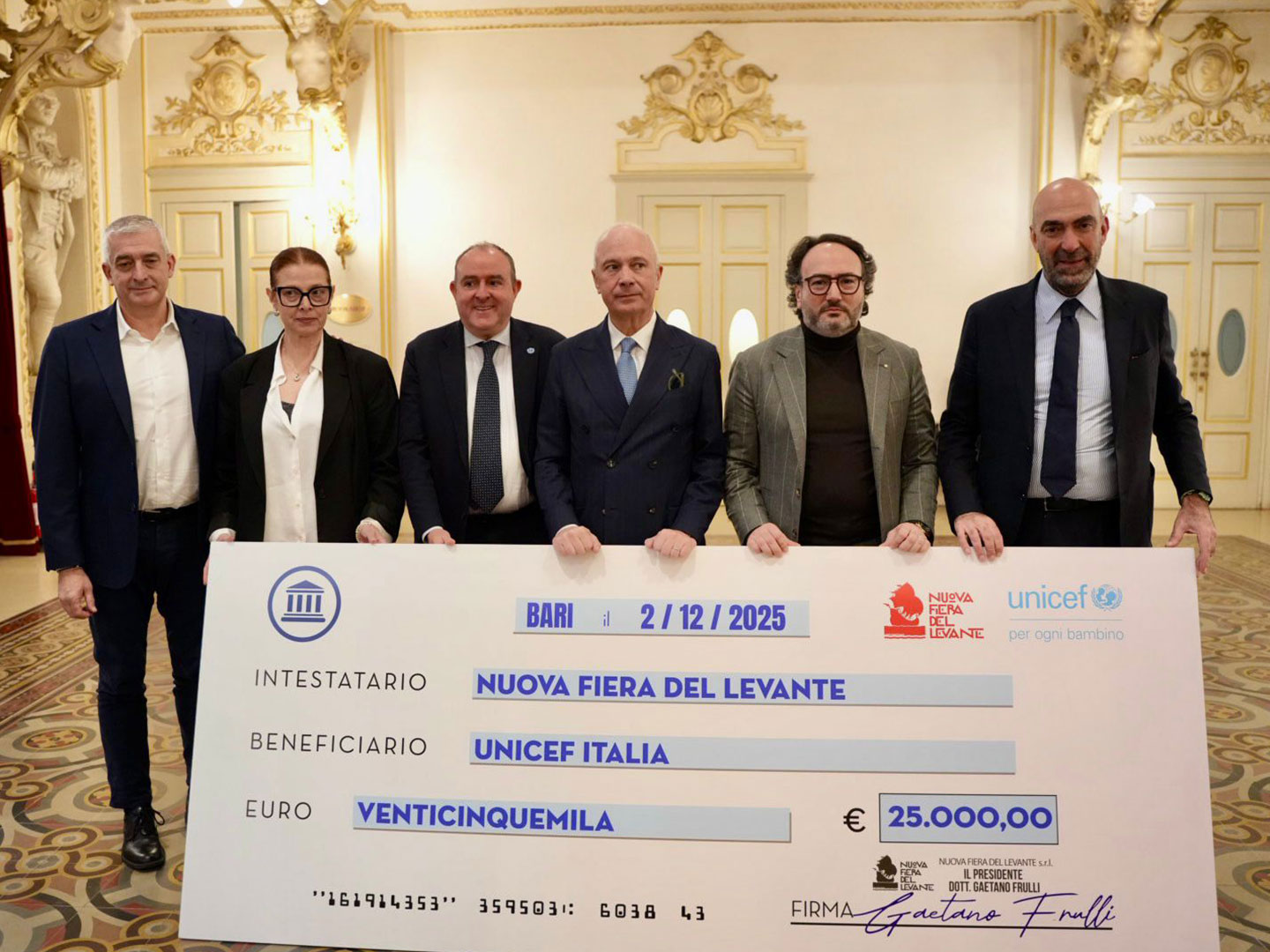 Martedì 2 dicembre, nel foyer del Teatro Petruzzelli, il presidente della Nuova Fiera del Levante, Gaetano Frulli, ha consegnato all’UNICEF l’assegno da 25.000 euro – frutto della raccolta solidale...
